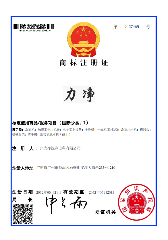 1.“力净”“力净LIJING”商标为我司持有商标,请通过国家商标局网站国家知识产权局商标局 中国商标网 (cnipa.gov.cn)核实证书的真实性。
